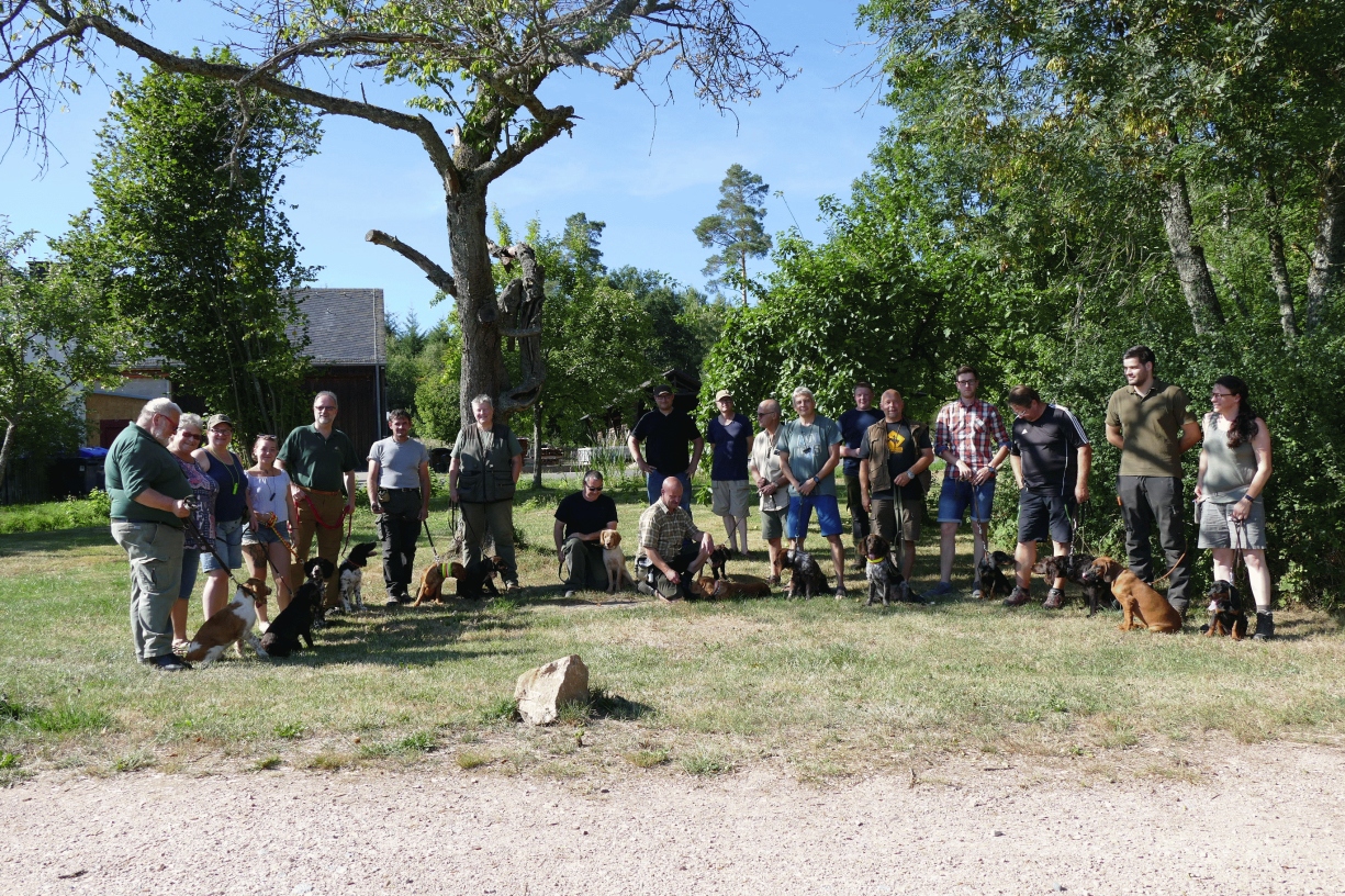 Die Motivation der Teilnehmenden ergab sich aus mehreren Aspekten. Zum einen war dies die Freude an der Gemeinsamkeit, zum anderen natürlich auch das Ansinnen, die jagdlichen Anlagen der Hunde zu wecken und zu fördern. Und nicht zuletzt wollten die Gespanne erste Schritte in Richtung Gehorsam gehen. Entsprechend entwickelten die Treffen eine gewisse Routine: Rennen und Toben förderte die Sozialisation der Welpen. War der erste Dampf raus, übten die Gespanne Sitz & Ablegen, jeweils mit „Bleib“. Zwischendurch wurde Leinenführigkeit geübt und die Bringfreude als Vorstufe zum Apport gefördert. Entsprechend der Altersphase der Hundchen blieben die Trainingseinheiten im spielerischen Bereich und das Verhalten der Hunde ausschließlich positiv bestärkt. Getreu dem Motto „4 Augen sehen mehr als 2“ unterstützten sich die Gespanne gegenseitig mit sehr viel Erfolg! Anfang August waren alle Gespanne in den Kommandos sicher und die Bringfreude top. Nach den Einheiten zur Folgsamkeit auf der Forstamtswiese wurde umgesetzt: Abwechselnd ging es um die Frühprägung auf der Fährte/Schleppe sowie die Förderung der Wasserfreude am Waldweiher. Beides einfach beginnend, später hinsichtlich des Schwierigkeitsgrades durchaus zur Herausforderung werdend. Einfachheit ist der Tot der Motivation.